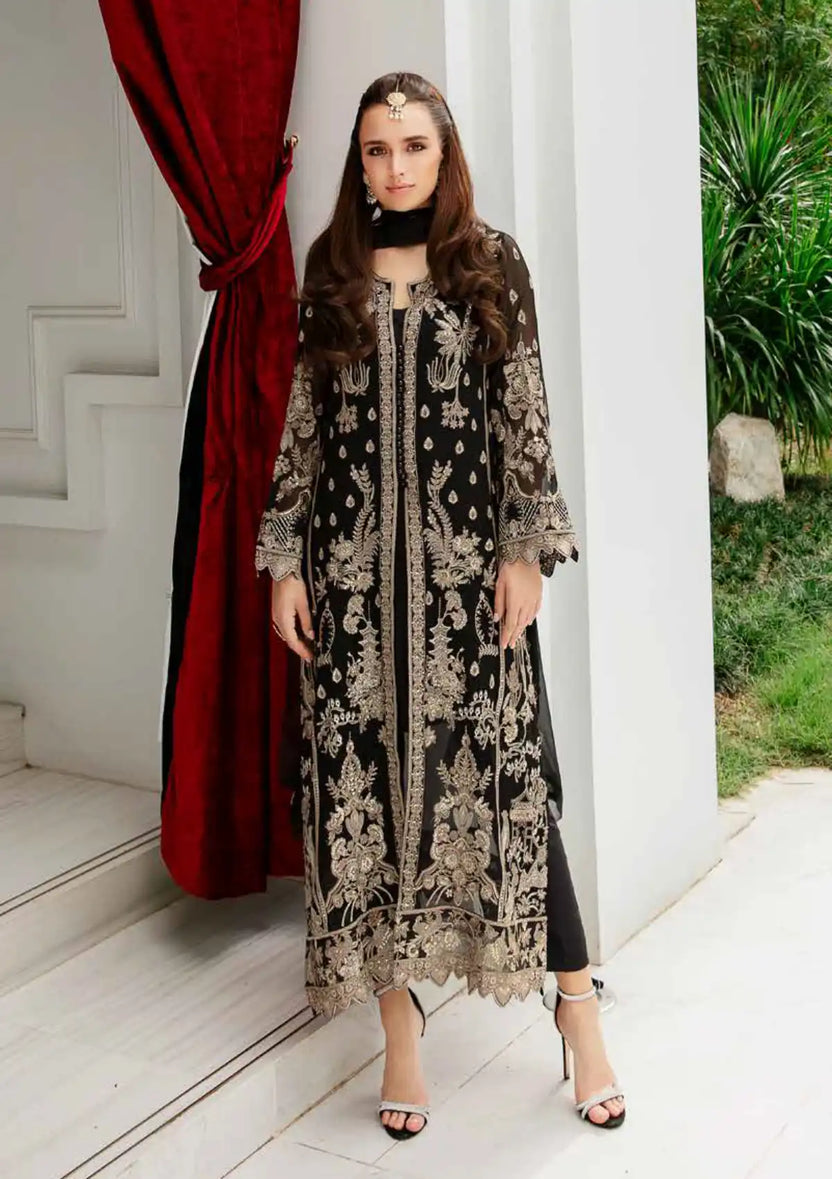 Fabric: Shirt Embroidered Front, Left Panel (Chiffon) 1Pc Embroidered Front, Right Panel (Chiffon) 1Pc Dyed Back (Chiffon) 1Pc Embroidered Sleeves (Chiffon) 1Pc Embroidered Sleeves Patti (Organza) 1.35 Yards Embroidered Front, Back Patti (Organza) 1.90 Yards Fabric: Chiffon+Organza Dupatta Embroidered Dupatta (Chiffon) 2.75 Yards Fabric: Chiffon Trouser Dyed Trouser (Grip) 2.50 Yards Fabric: Grip Color: Black |